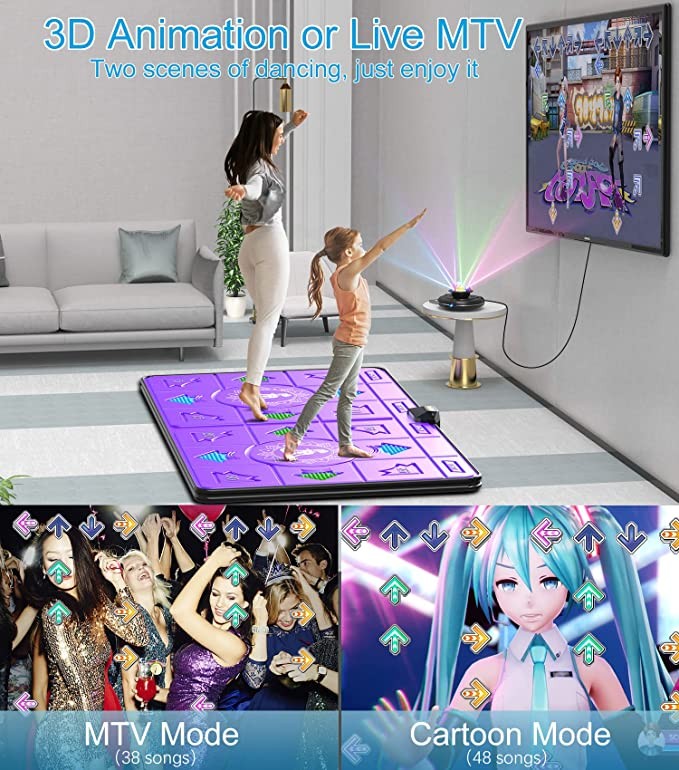 【Free Dance Socks & Easy to Install】 Free dance socks can improve the dance game experience. Device installation is very convenient and simple, just use HDMI to connect the host and TV. PU+EVA high quality non-polluting and harmless material to human body. The non-slip design of the rubber particles at the bottom of the dance mat makes it more secure. If you encounter any problems, please feel free to contact us via Amazon message and we will get back to you immediately.