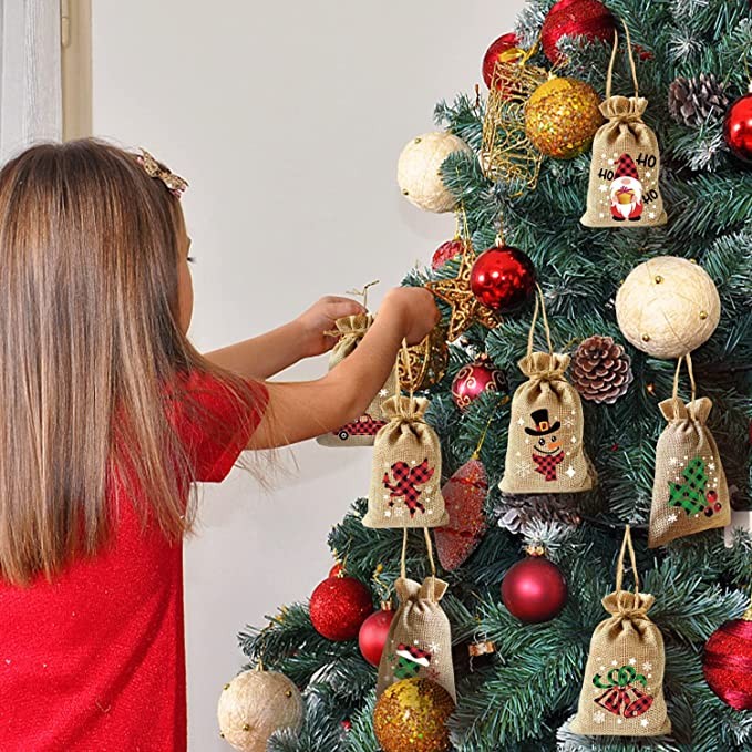 VEYLIN 12 pieces of Christmas jute gift bags in 12 designs. These lovely Xmas jute sacks features Santa Claus, snowman, car, bell, Christmas tree etc, the motifs are well printed and ideal for kids Christmas party gifts. Product description: Quantity: 12pcs