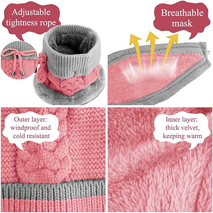 • 3 IN 1 ACCESSORIES - 1 set of 3 includes a knitted winter hat with fleece lining, adjustable scarf and a detachable face shield, this combo will keep your head, ears and neck warm.